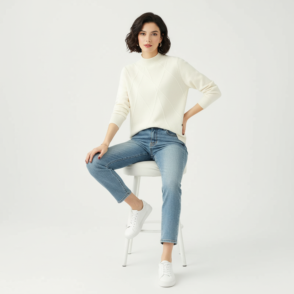 Dit ontwerp is gemaakt voor momenten waarop comfort en uitstraling moeiteloos samenkomen. De fijne breistructuur voelt zacht aan op de huid en valt soepel langs het lichaam, terwijl het subtiele patroon en de hoge hals zorgen voor een rustige, verfijnde look. Een tijdloos item dat je gemakkelijk inpast in je dagelijkse garderobe.